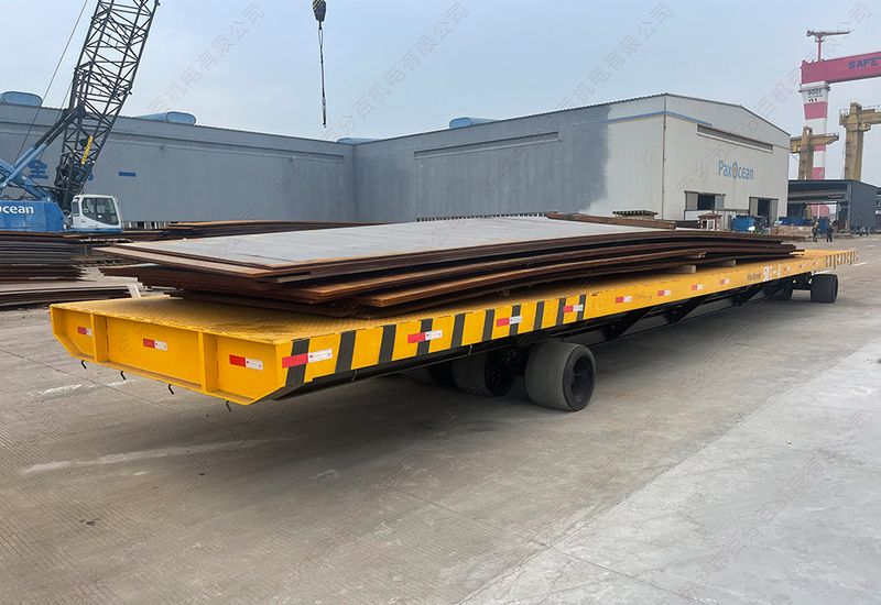該案例中的平板車是舟山的一個項目,主要被用來在廠區(qū)和碼頭之間轉(zhuǎn)運煤渣和鋼板。轉(zhuǎn)運煤渣的時候配套有可拆卸的料斗裝置。轉(zhuǎn)運鋼板的時候吧料斗拆除掉,平板車可以裝在50噸的鋼板。