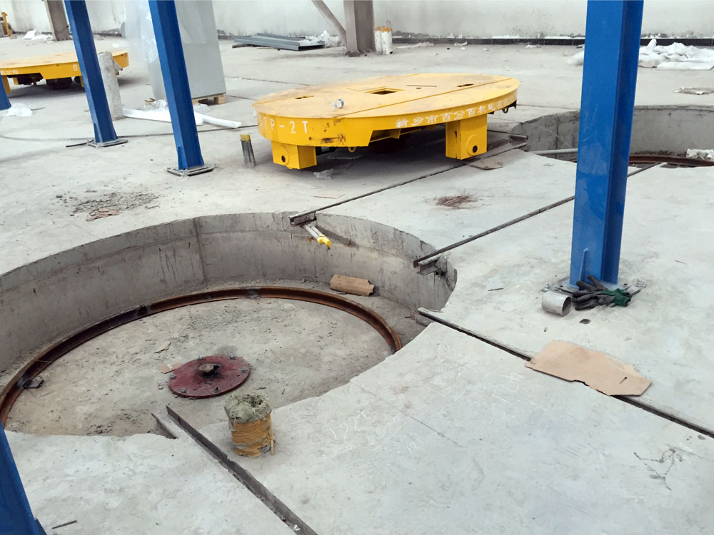 我公司生產的電動換軌轉盤是一種能夠在90度轉彎的軌道上運行的轉運車。它的工作原理是:轉運車運行至電動旋轉平臺上,通過手動手動或自動旋轉電動旋轉平臺,與垂直軌道對接,使轉運車可沿垂直軌道運行,實現(xiàn)90度轉彎,它非常適用于裝備生產線的環(huán)形軌道、交叉軌道等工作場合。通過運載車輛行駛到換軌轉盤上,軌道轉盤轉過指定角度的軌道上,來實現(xiàn)任意角度交叉軌道的換軌操作,安裝自動化定位裝置,實現(xiàn)平車平穩(wěn)的軌道對接,可通過自動化定位裝置來調整對接軌道的角度來實現(xiàn)準確對接,另外可以實現(xiàn)自動化無人控制。